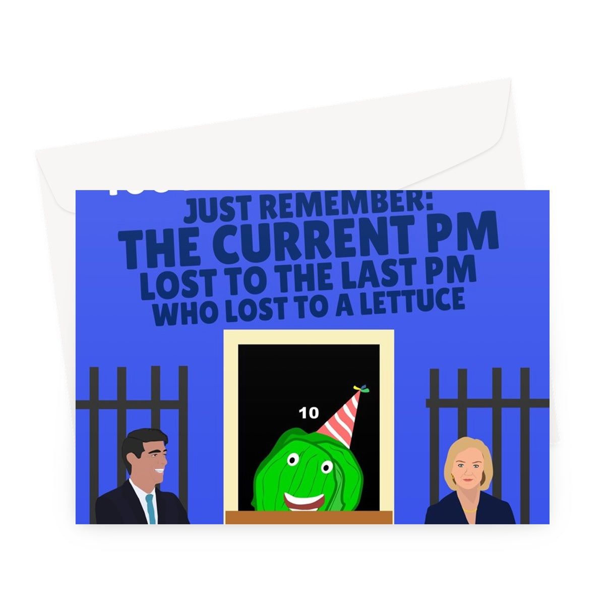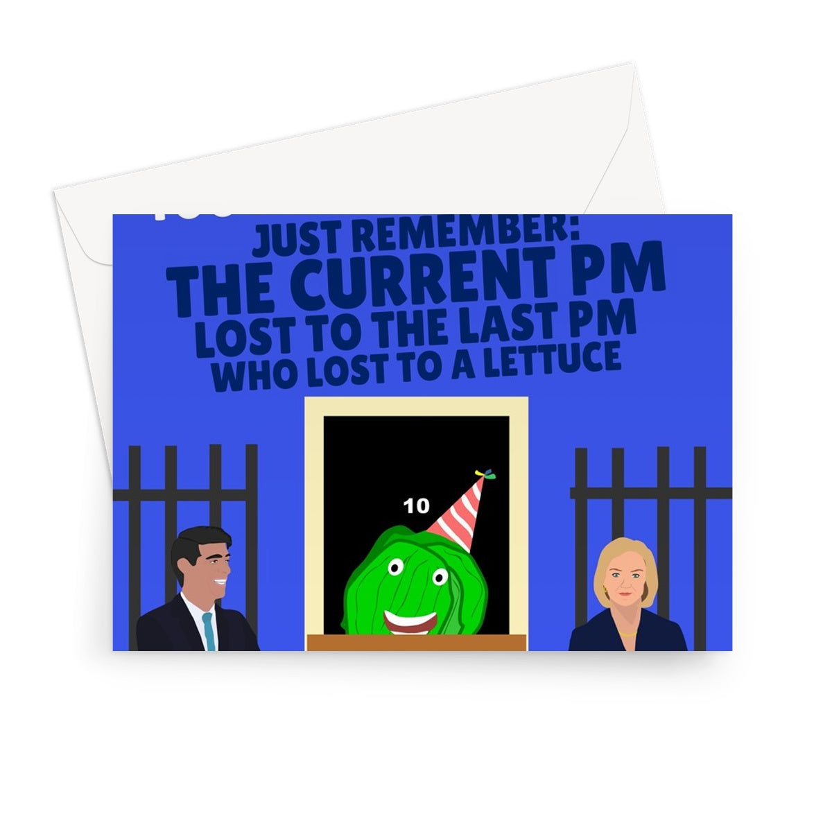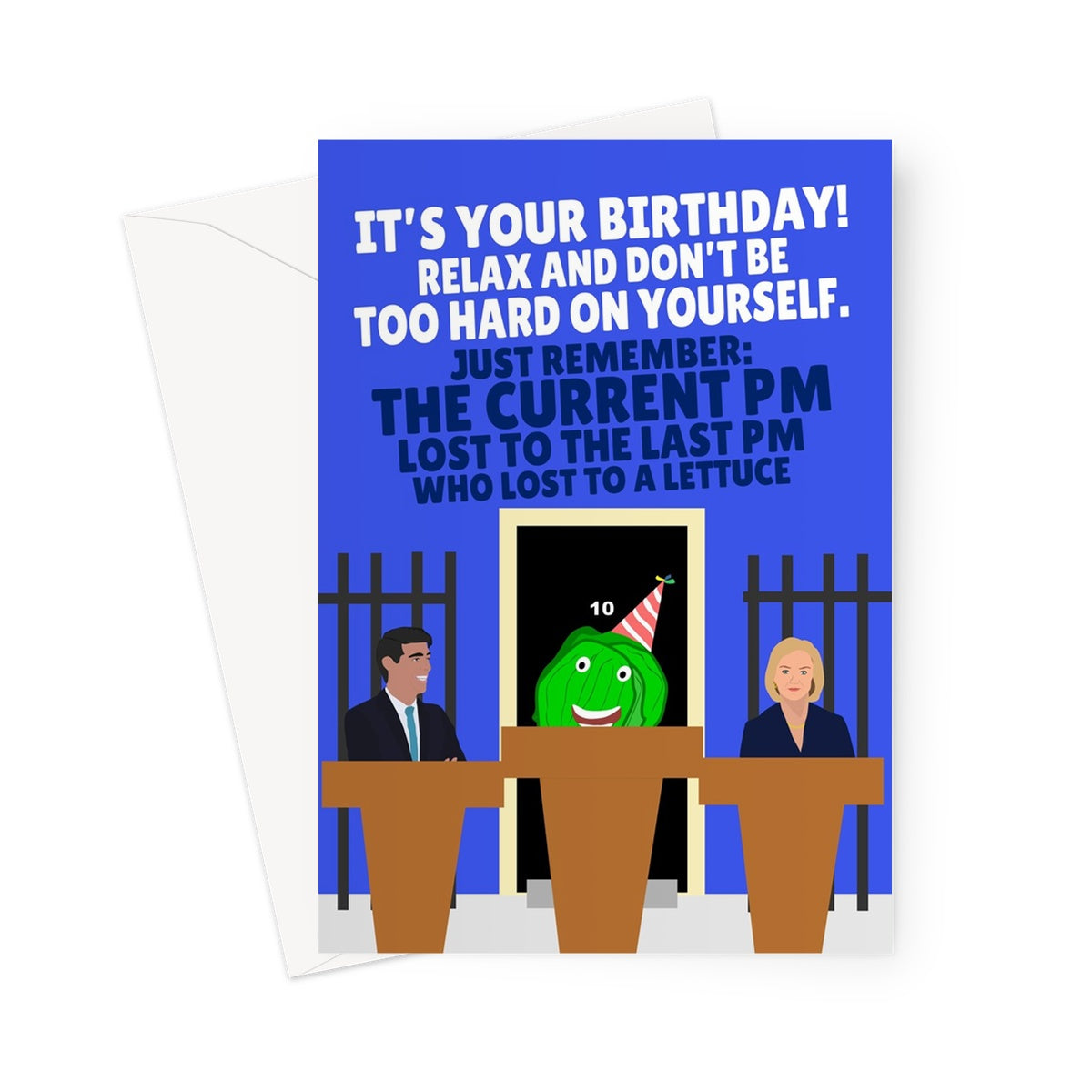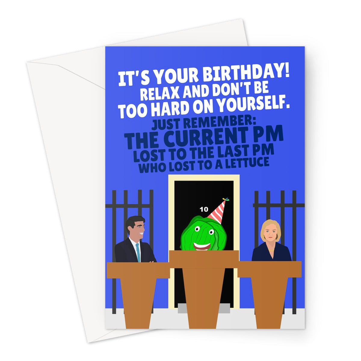 It's your birthday! Don't be hard on yourself. Remember the PM lost to a Lettuce Funny Politics Rishi Liz Truss Meme Greeting Card