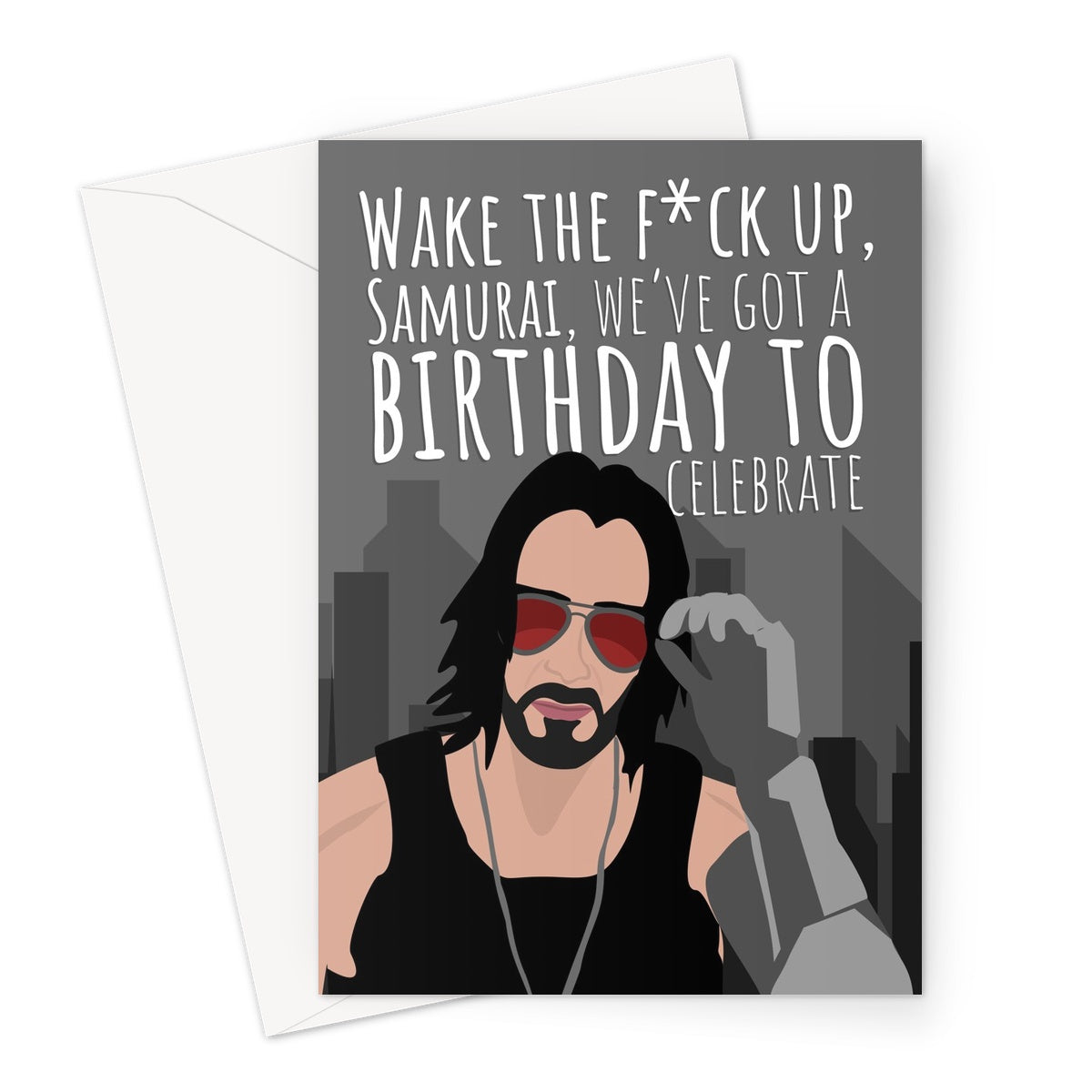 Wake the Fuck Up Samurai We've Got a Birthday to Celebrate Keanu Reeves Cyberpunk Gamer Game Fan Love Funny Greeting Card